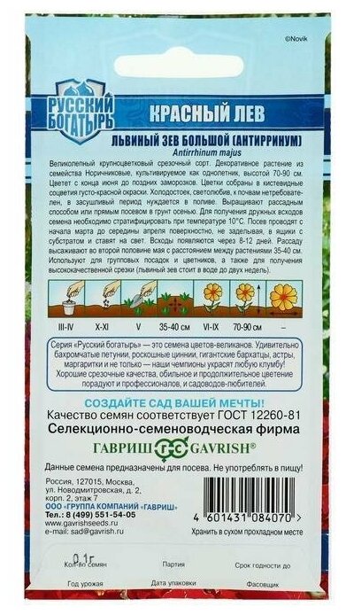 Семена цветов Антирринум (Львиный зев) "Красный лев", серия Русский богатырь, 0,1 г информация: