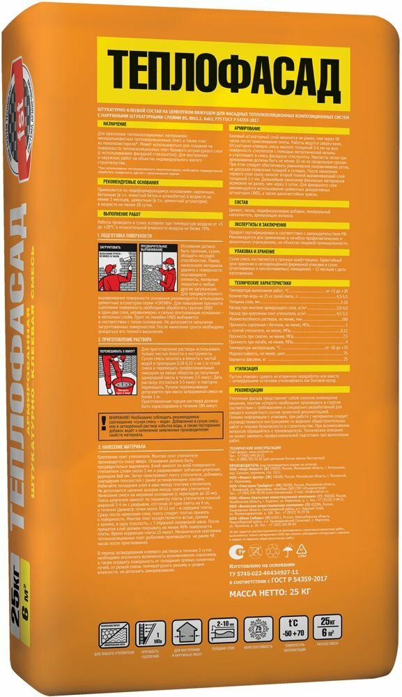 Юнис Теплофасад клей-штукатурка для теплоизоляции (25кг) / UNIS Теплофасад фасадная штукатурно-клеевая смесь (25кг) информация: