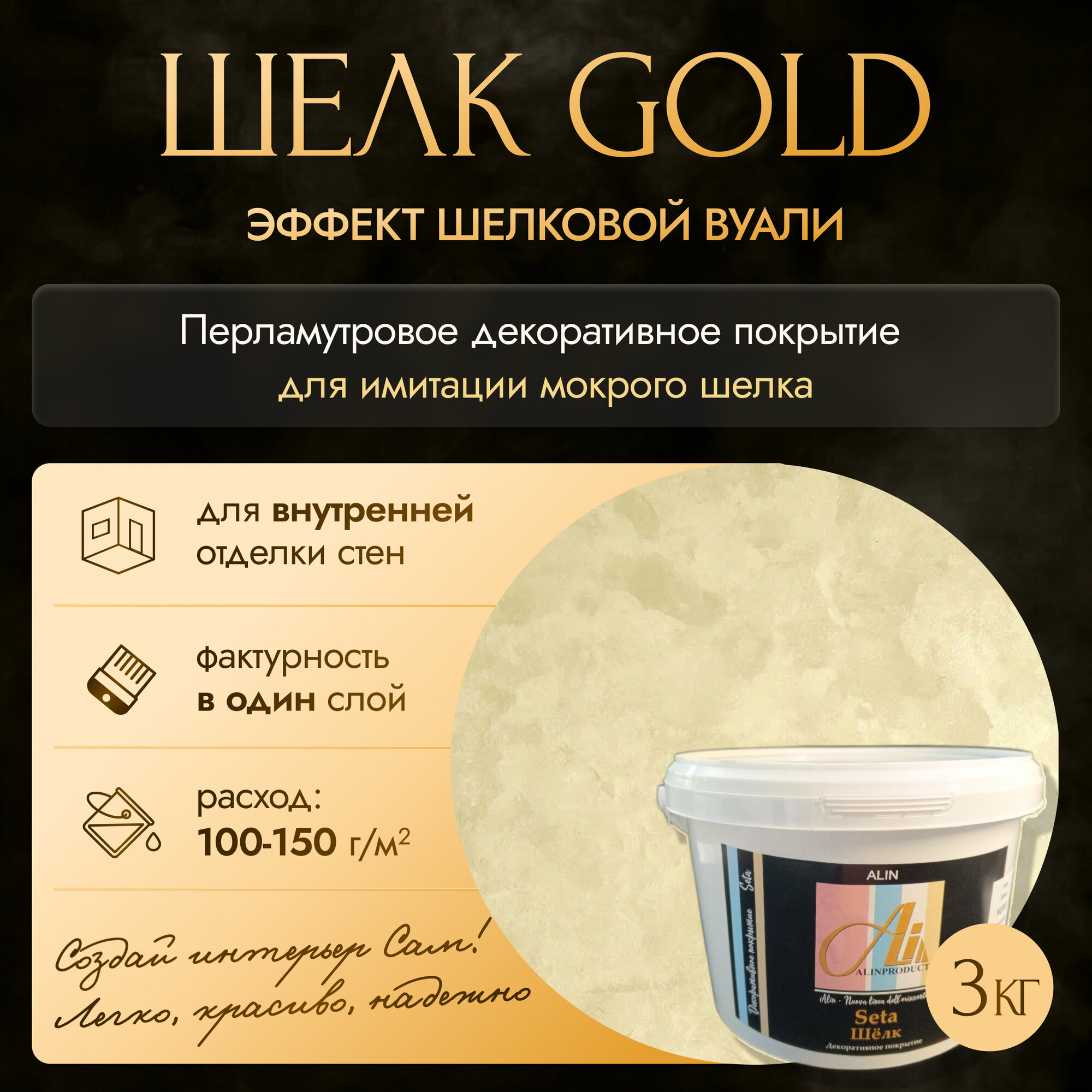 Краска, Декоративное покрытие ALINPRODUCT Шелк Сета Seta база золото - перламутровая декоративная штукатурка для имитации мокрого шелка Акриловая, Фактурная, *Декоративная, Глянцевое покрытие, 3 кг, золотистый