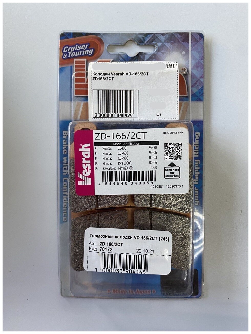 Тормозные колодки Vesrah ZD-166/2CT информация:
