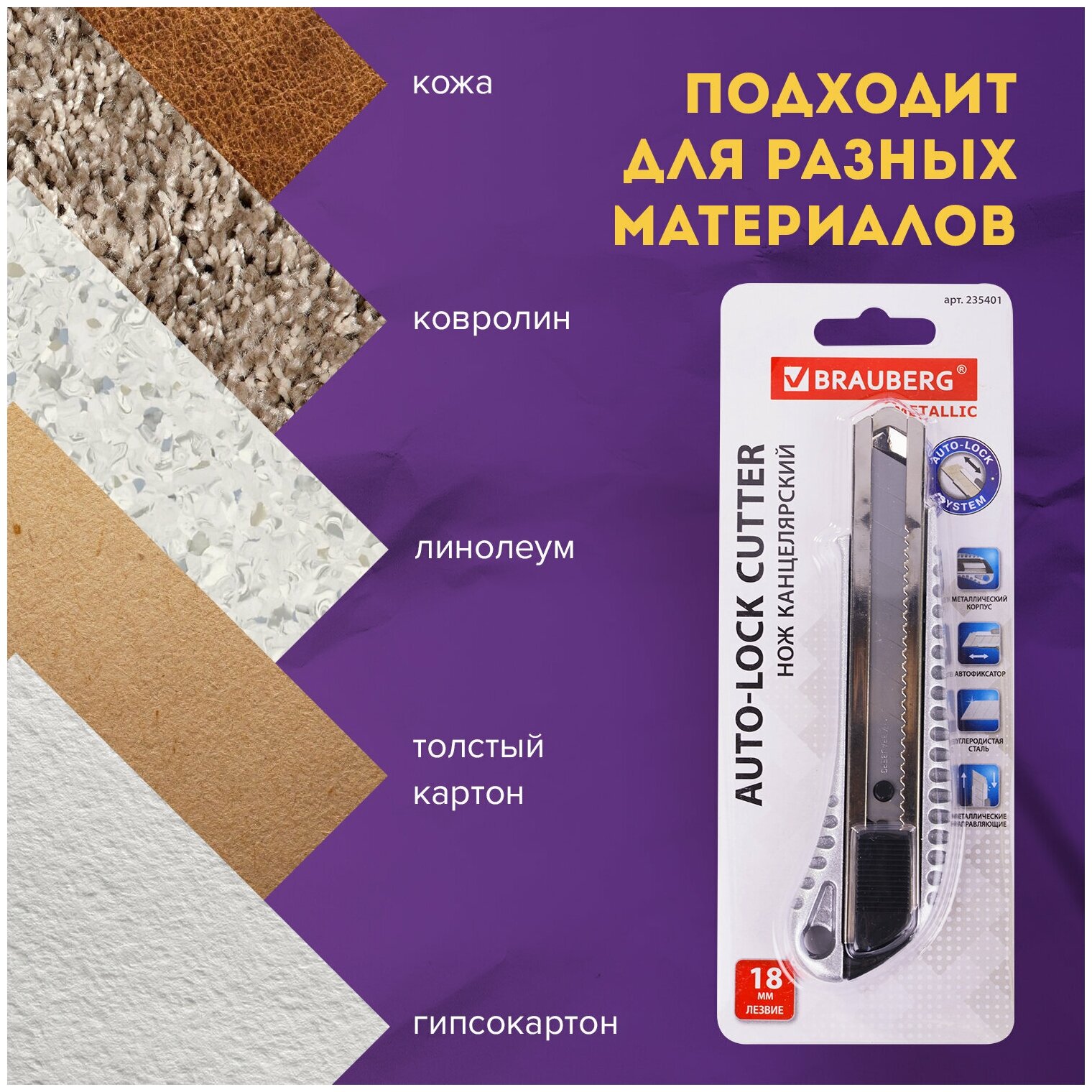 Нож канцелярский 18 мм BRAUBERG "Metallic", металлический корпус (рифленый), автофиксатор, блистер, 235401 информация:
