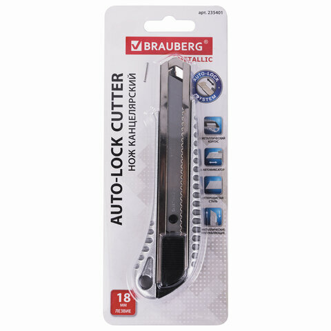 Нож канцелярский 18 мм BRAUBERG "Metallic", металлический корпус (рифленый), автофиксатор, блистер, 235401 (цена за 1 ед.товара)