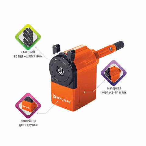 Точилка механическая настольная для карандашей с контейнером для стружки Brauberg Jet, металлический механизм, корпус оранжевый