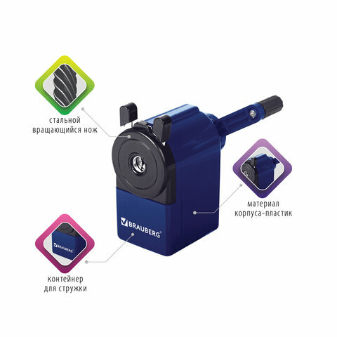 Точилка механическая настольная для карандашей с контейнером для стружки Brauberg Jet, металлический механизм, корпус синий