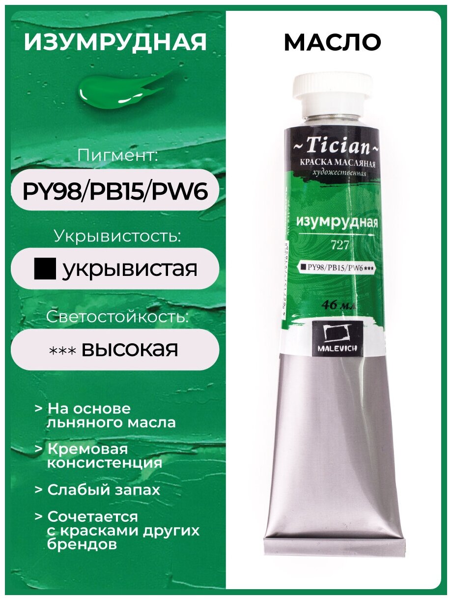 Масляные Малевичъ Масляная краска Tician малевичъ, туба 46мл, 727 Изумрудная