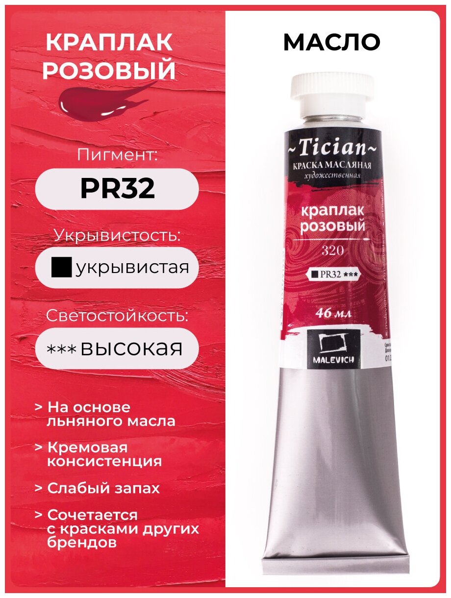 Отзывы на Масляные Малевичъ Масляная краска Tician малевичъ, туба 46мл, 320 Краплак розовый