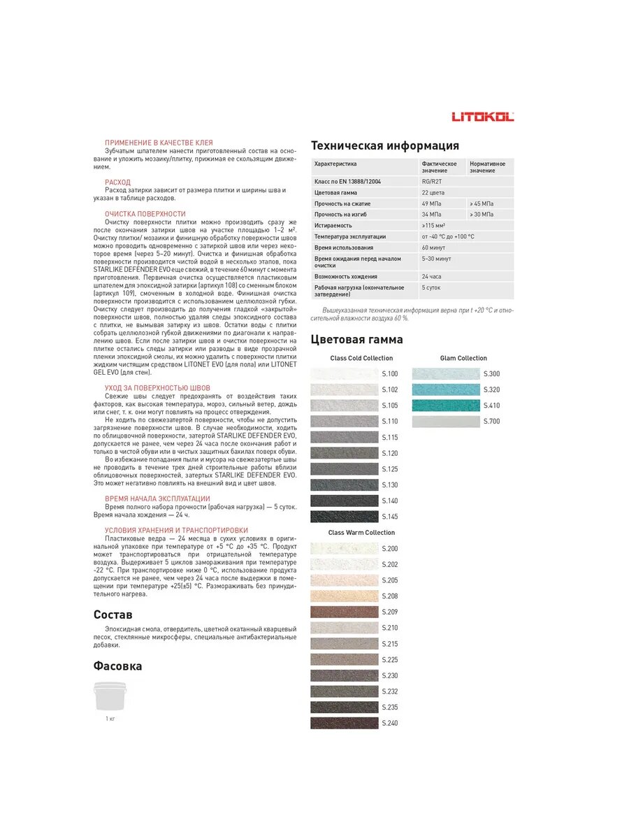Эпоксидная затирка LITOKOL STARLIKE DEFENDER EVO Жемчужно-серый 1 кг 7 214 ₽