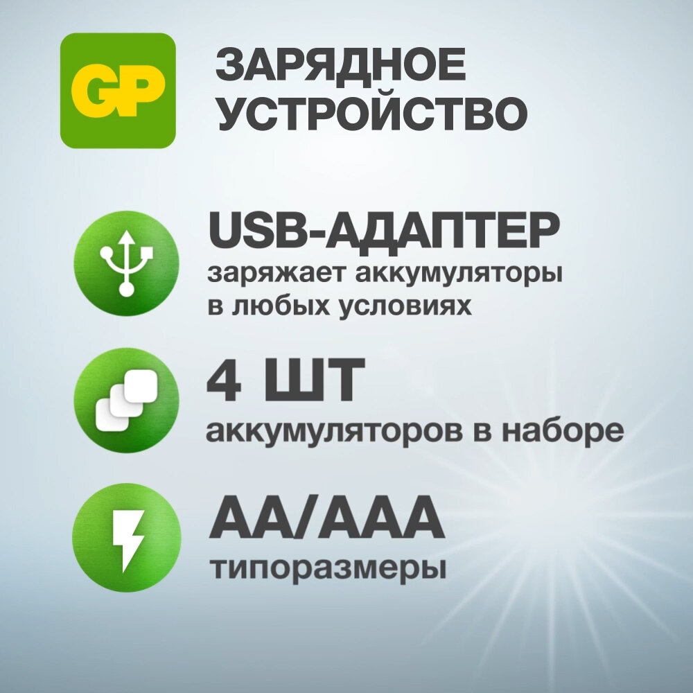 Зарядное устройство + аккумуляторы GP USB + 4 аккум. АA (HR6) 2700mAh + адаптер (GP 270AAHC/CPBA-2CR4) информация: