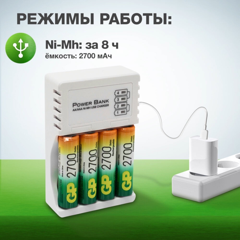 Аккумулятор Ni-Mh 2700 мА·ч 1.2 В GP Rechargeable 2700 Series AA + Зарядное устройство USB CPB + Адаптер 1A, 4 шт.