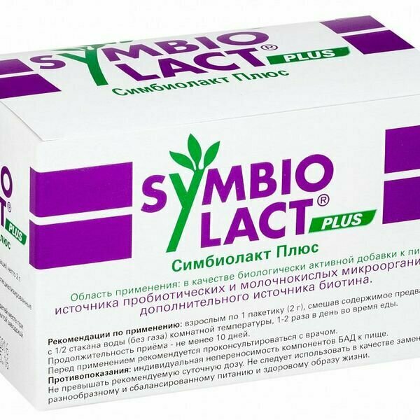| Показания к применению | Рекомендован в качестве биологически активной добавки к пище – источника пробиотических и молочнокислых микроорганизмов, дополнительного источника биотина. Симбиолакт Плюс эффективен также при различных нарушениях иммунитета, вызванных дисбалансом микрофлоры кишечника, в том числе вследствие: приема антибиотиков, кортикостероидов, слабительных; несбалансированного питания; стресса и напряжения; курения и злоупотребления алкоголем. |