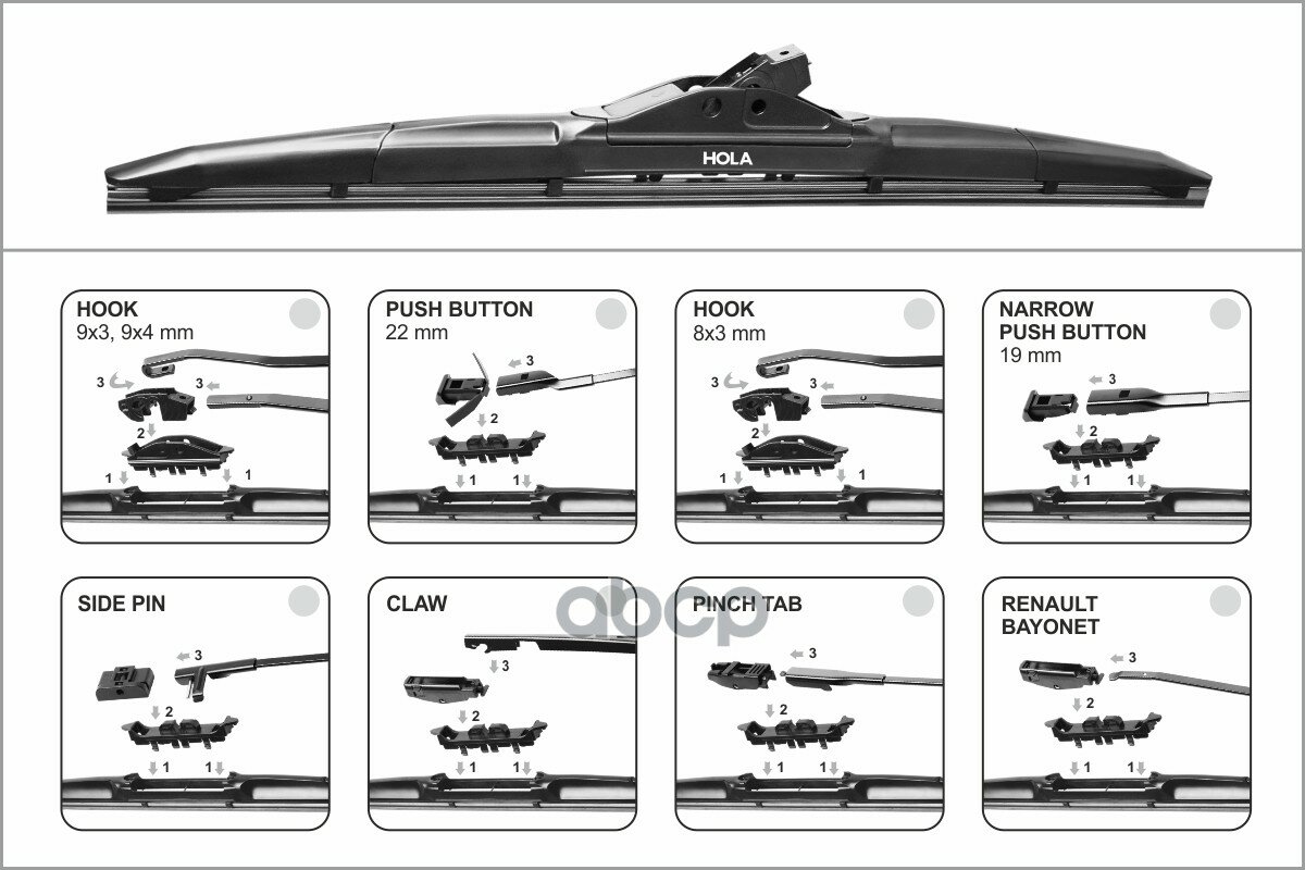 Стеклоочиститель Гибридный 21 /530mm Адаптеры (Крючок, Side Pin, Top Lock, Pinch Tab, Bayonet, Push Butto HOLA арт. HQ21