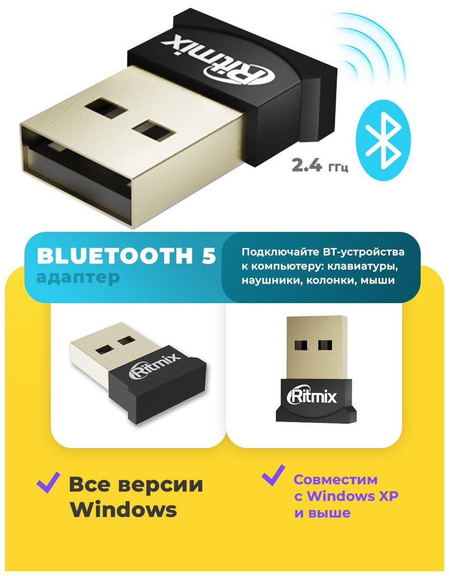 Bluetooth-адаптер для ПК RITMIX RWA-350, версия 5, USB