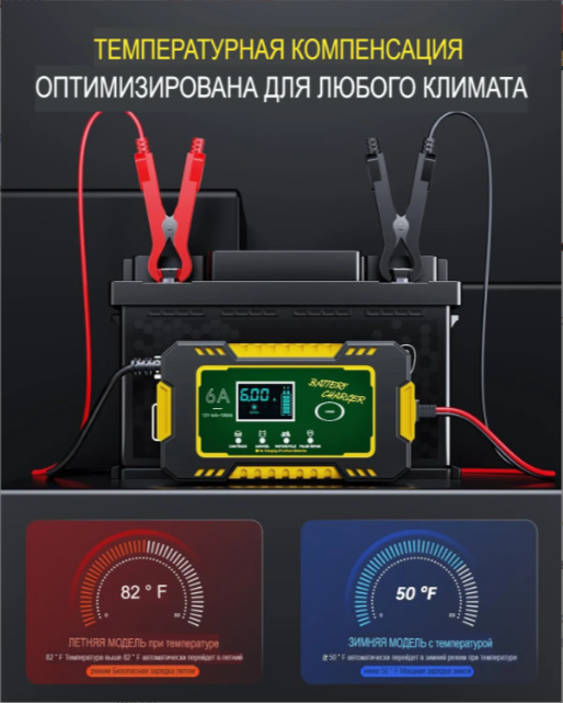 | Дополнительная информация | Зарядка для аккумулятора автомобиля оснащена цифровым дисплеем, который отображает текущие параметры зарядки: уровень заряда, напряжение, ток и температуру окружающей среды |
