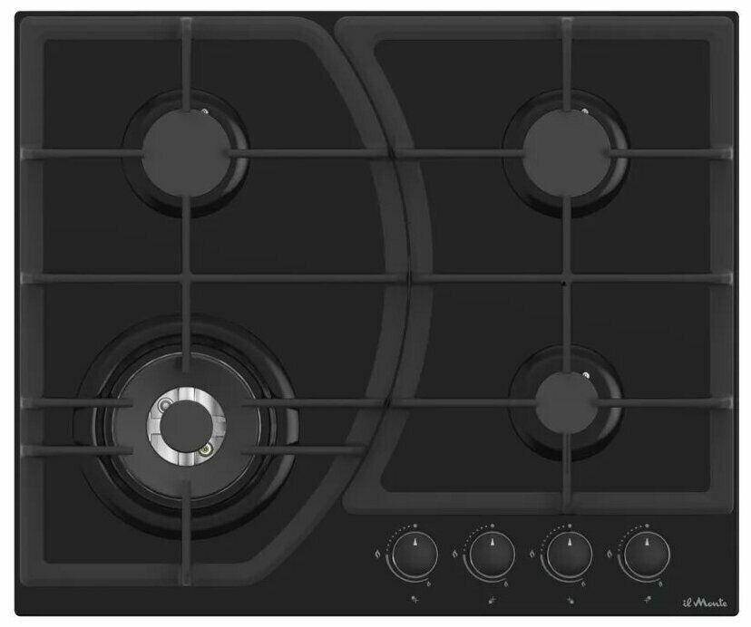 Варочная панель газовая, Закаленное стекло, 60 см, Газ-контроль, Турбо-конфорка WOK, Автоподжиг, Чугунные решетки, il Monte BH-674G