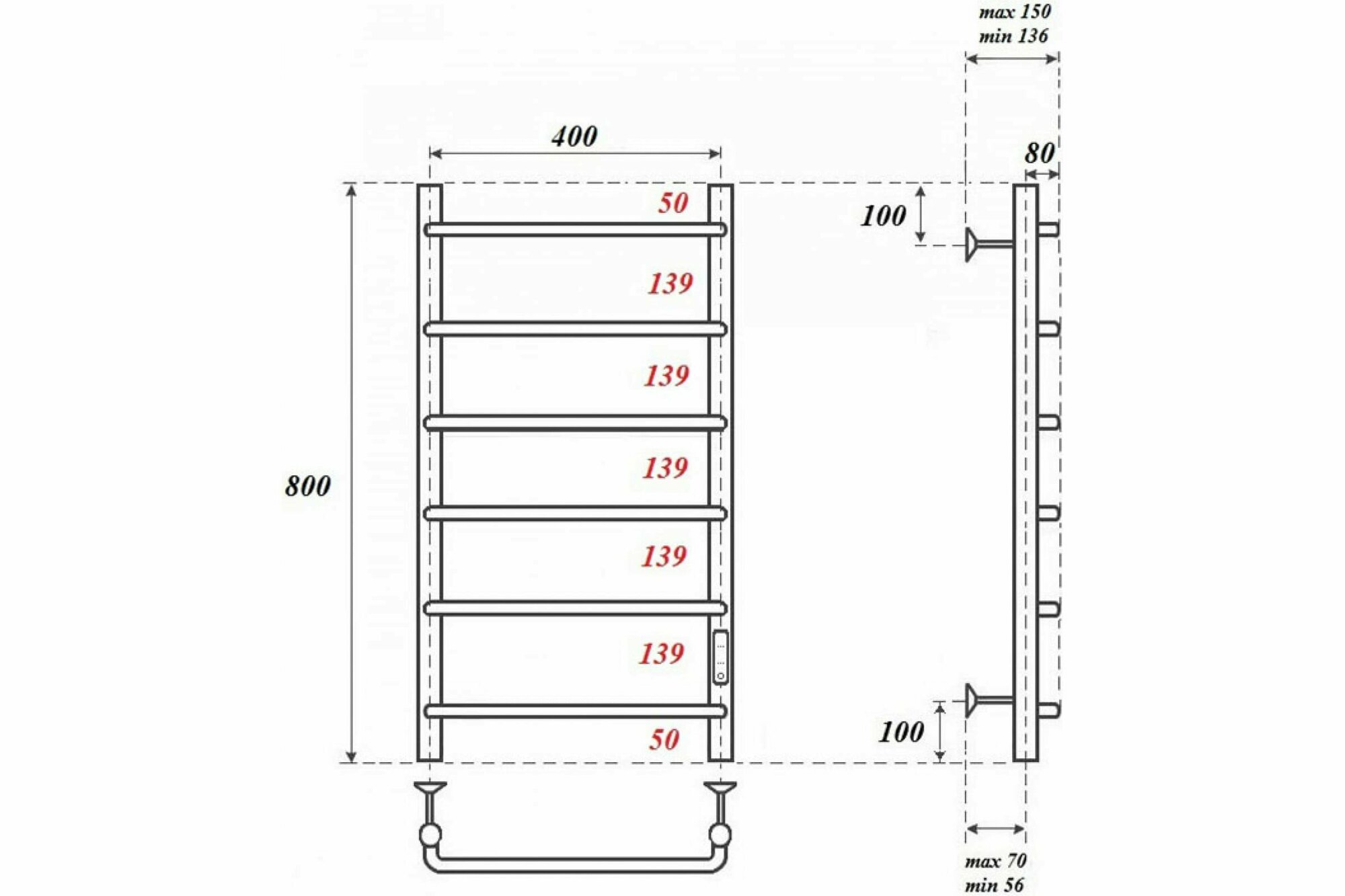 Полотенцесушитель электрический POINT PN08848 П6 400x800 диммер справа хром информация:
