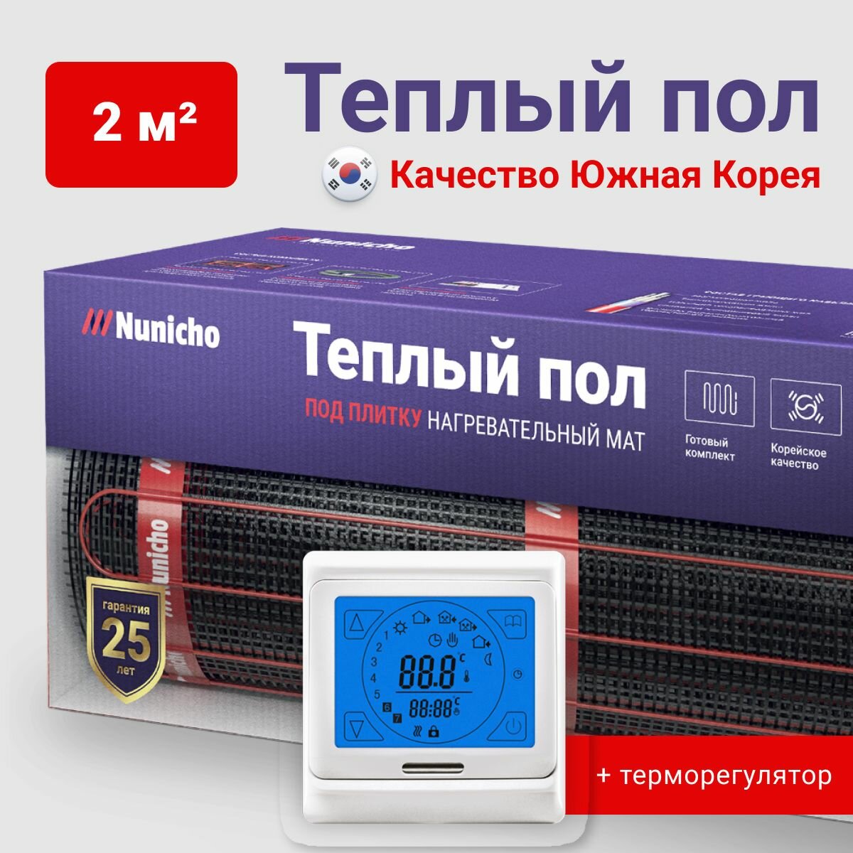 Теплый пол под плитку в стяжку NUNICHO 2 м2, 200 Вт/м2 с программируемым серебристым терморегулятором электрический нагревательный мат
