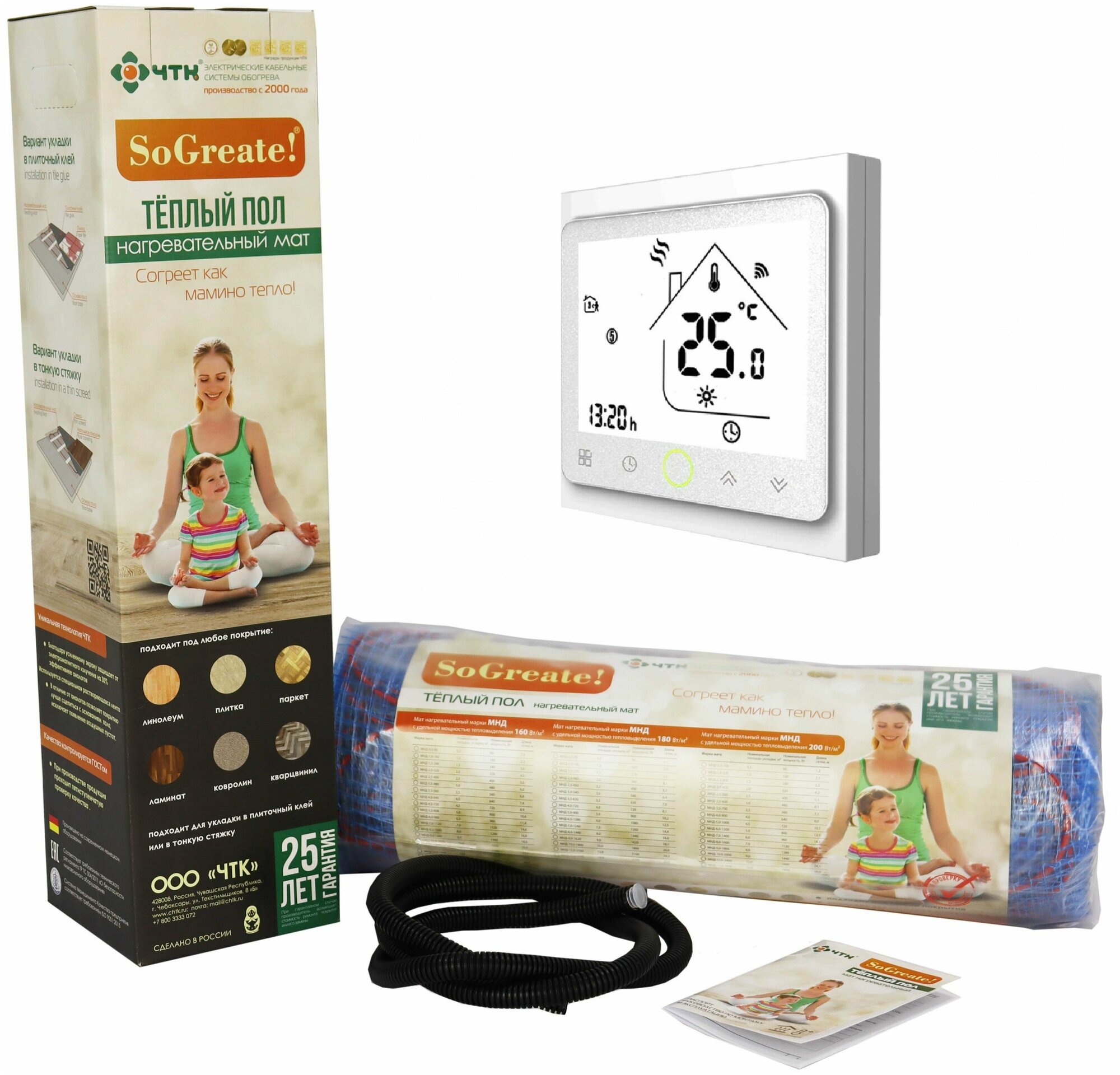 Комплект: Теплый пол ЧТК. Мат нагревательный SoGreate! 160 1,0 кв.м. 160 Вт. с белым WIFI терморегулятором информация: