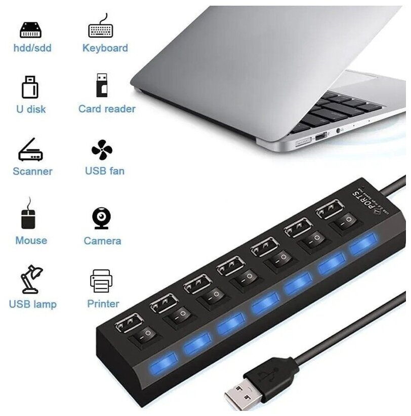 10 цен на USB Hub разветвитель на 7 USB с выключателями (Черный)