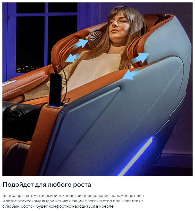 | Регулировки | зона массажа / интенсивность массажа / настройка под рост / угол наклона подставки для ног / угол наклона спинки / ширина между роликами |