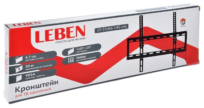 LEBEN Кронштейн для ТВ наклонный, 23"-55", до 50кг, 75x75 до 400x400мм, мет