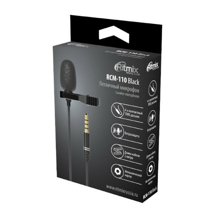 RITMIX Микрофон RITMIX RCM-110 Black, в комплекте держатель-клипса, разъем 3.5 мм, кабель 2 м информация: