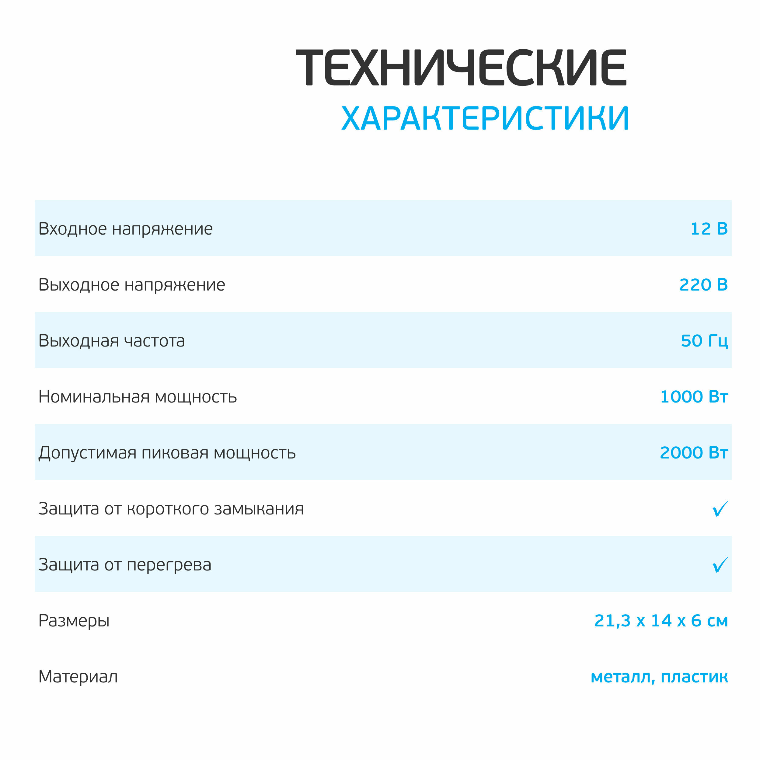 Преобразователь напряжения AVS (Инвертор) 12 - 220 В 1000 Вт информация: