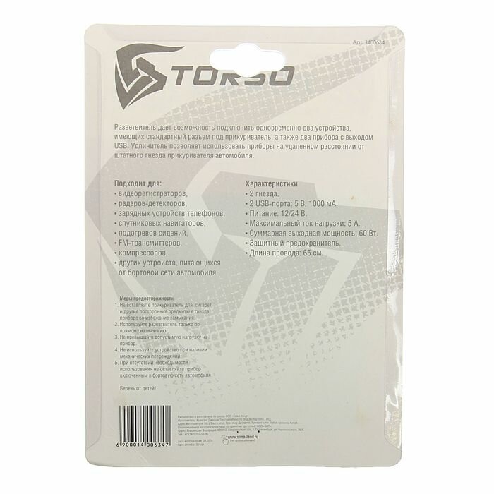 TORSO Разветвитель прикуривателя TORSO, 2 гнезда, 2 USB, 12/24 В, провод 65 см информация: