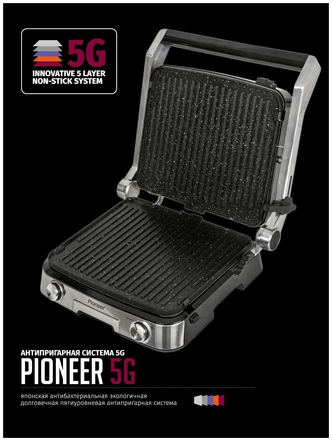 Гриль Pioneer со съемными антипригарными панелями+доп.панелью, 3 рабочих положения, регулировка температуры, антипригарная система 5G, 2000 Вт
