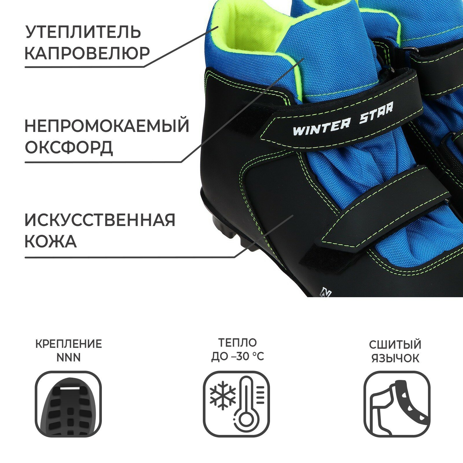 Ботинки лыжные детские Winter Star control kids, NNN, искусственная кожа, цвет чёрный/синий/лайм-неон, лого белый, размер 34