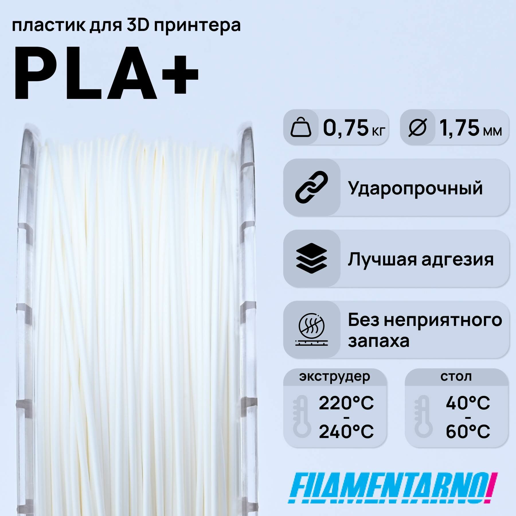 10 цен на PLA+ белый 750 г, 1,75 мм, пластик Filamentarno для 3D-принтера