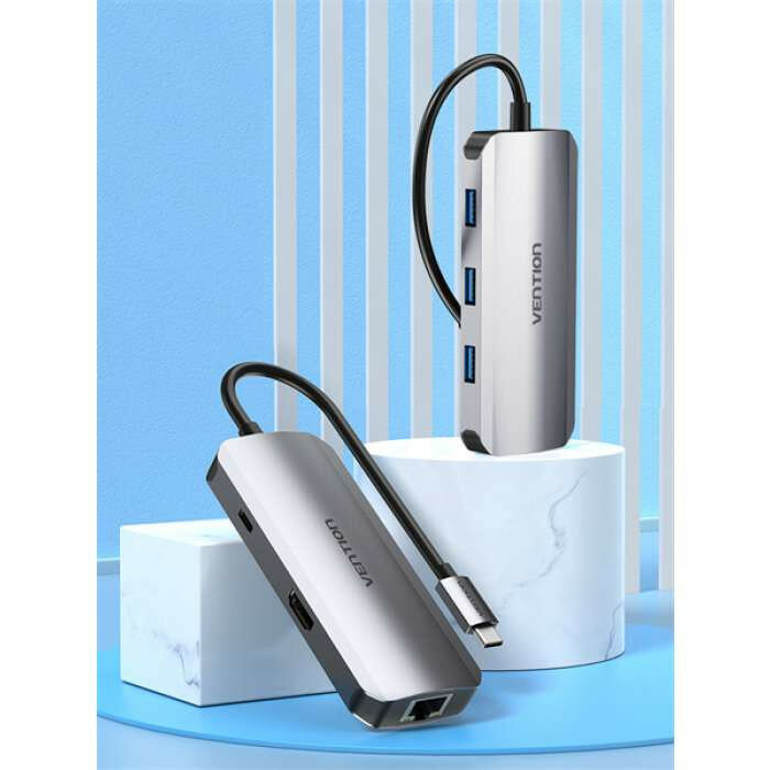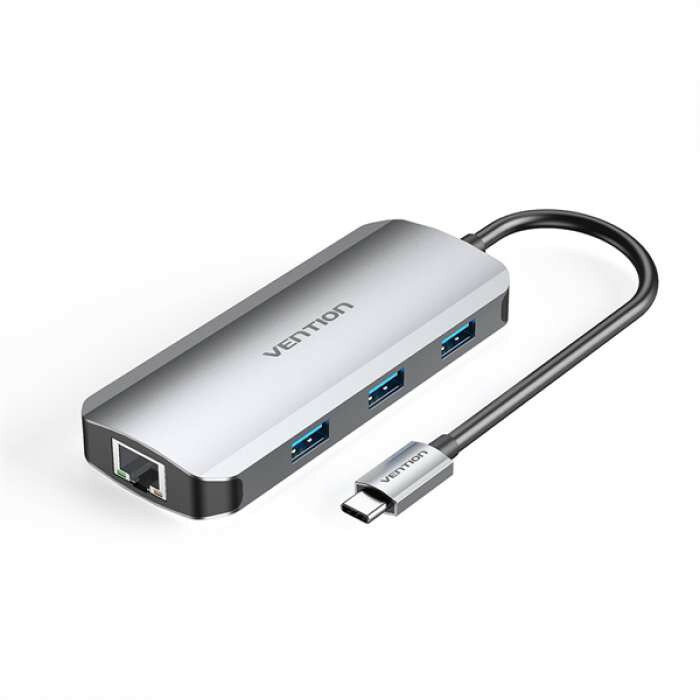 10 цен на Порт-репликатор Vention USB-C to HDMI/USB 3.0x3/RJ45/PD Docking Station 0.15M Gray Aluminum Alloy Type