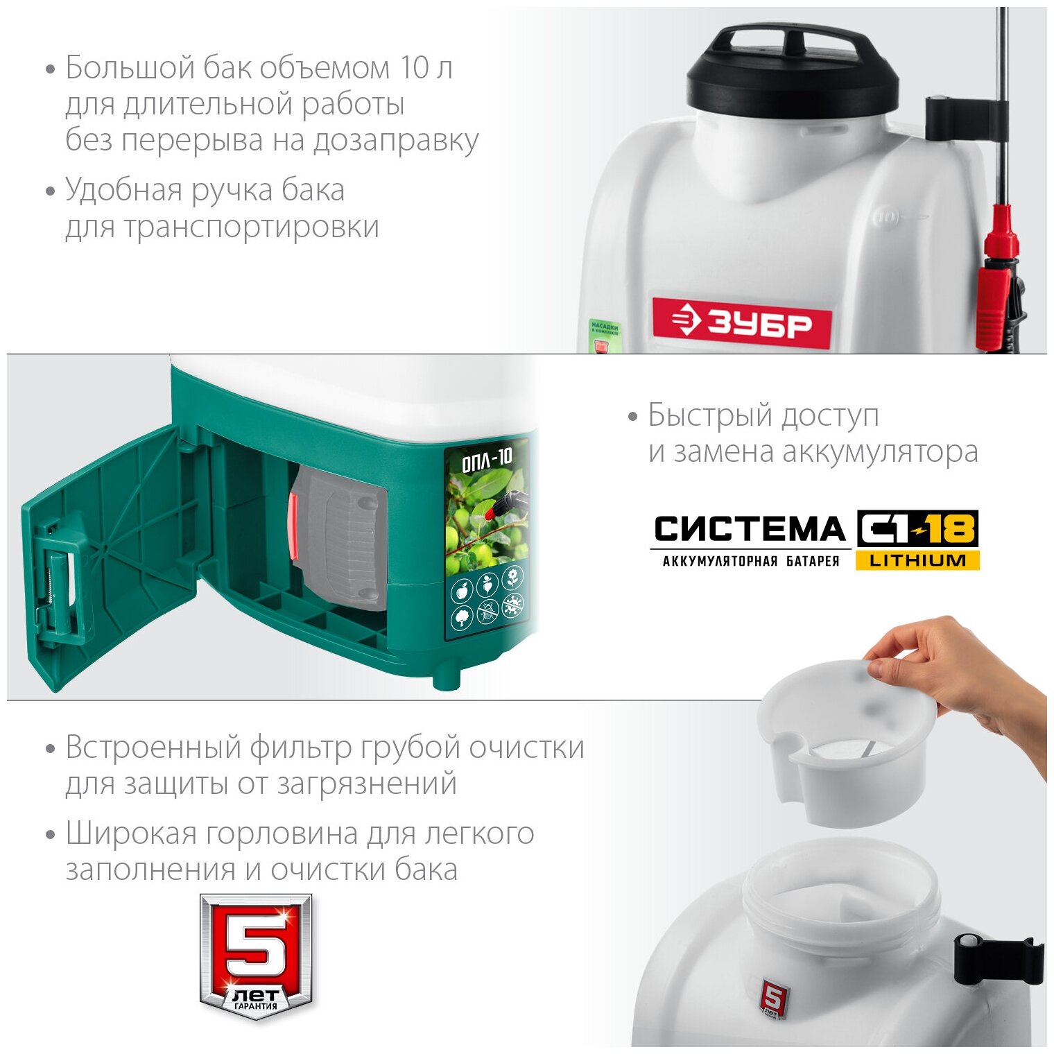 ЗУБР 10 л бак, без АКБ, опрыскиватель аккумуляторный, Li-Ion 18В ОПЛ-10