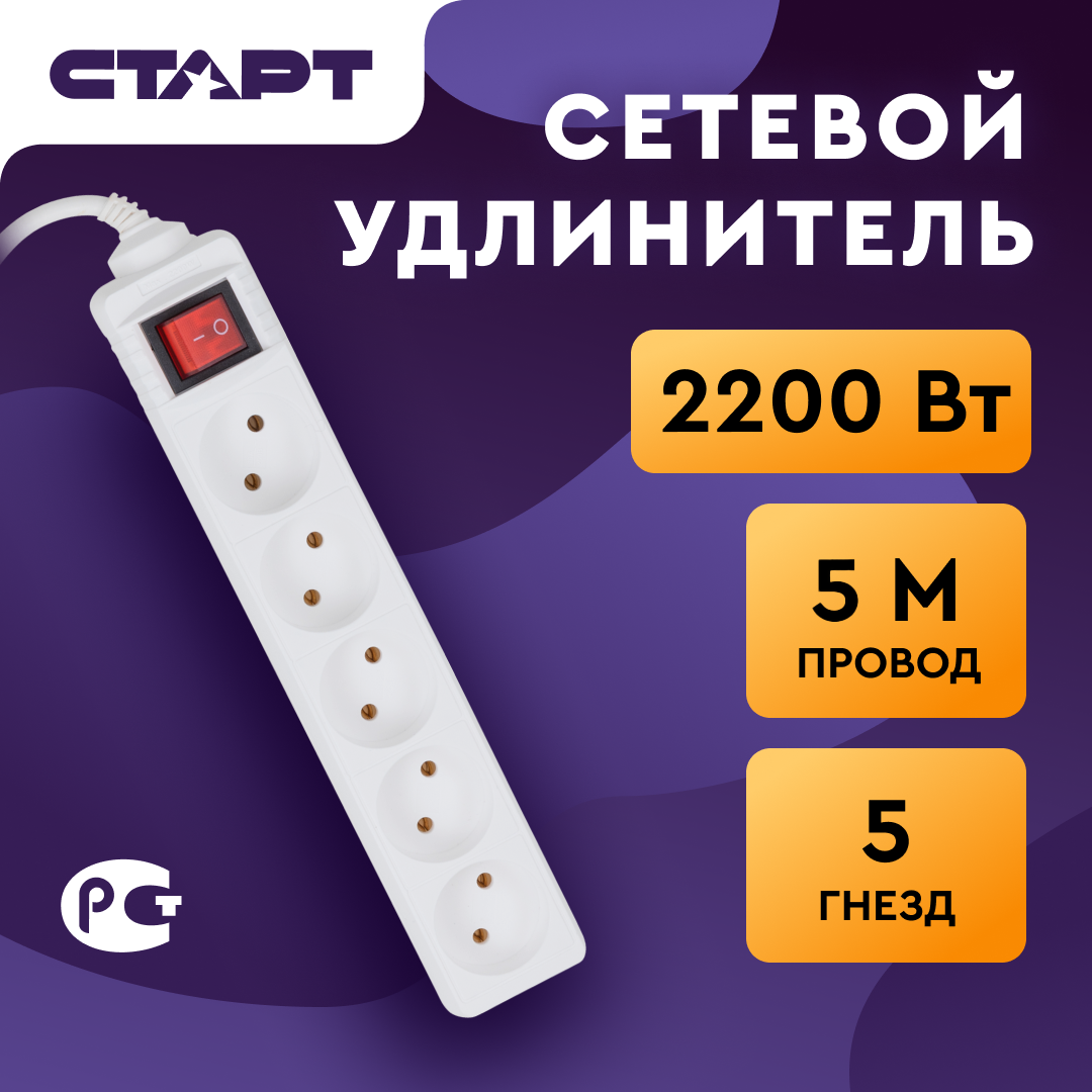 Удлинитель СТАРТ S 5x5-Z, 5 розеток, 5 м, с/з, 10А / 2200 Вт