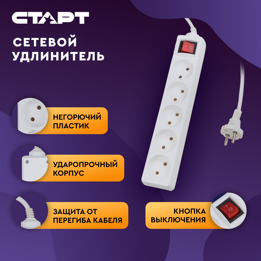Сетевой удлинитель старт, S 5x5 -V, с выключателем, колодка 5 розетки, шнур 5 м информация: