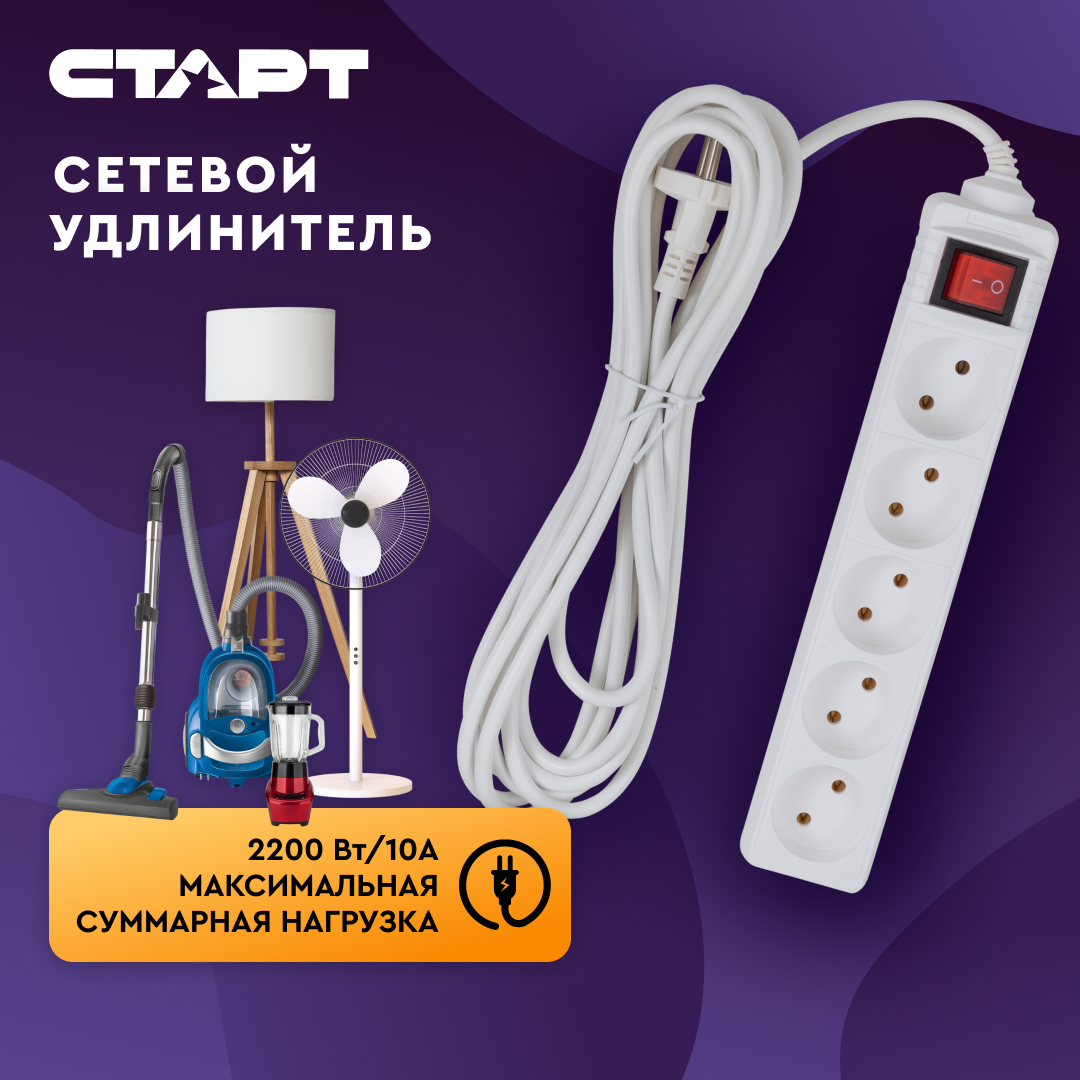 10 цен на Сетевой удлинитель старт, S 5x5 -V, с выключателем, колодка 5 розетки, шнур 5 м