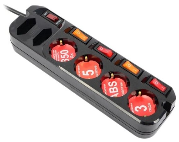 | Дополнительная информация | степень подавления помех: до 30 дБ, максимальная рассеиваемая энергия: 350 Дж, розетки: евро стандарт 4 шт., узкие 2 шт., термобиметаллический предохранитель |