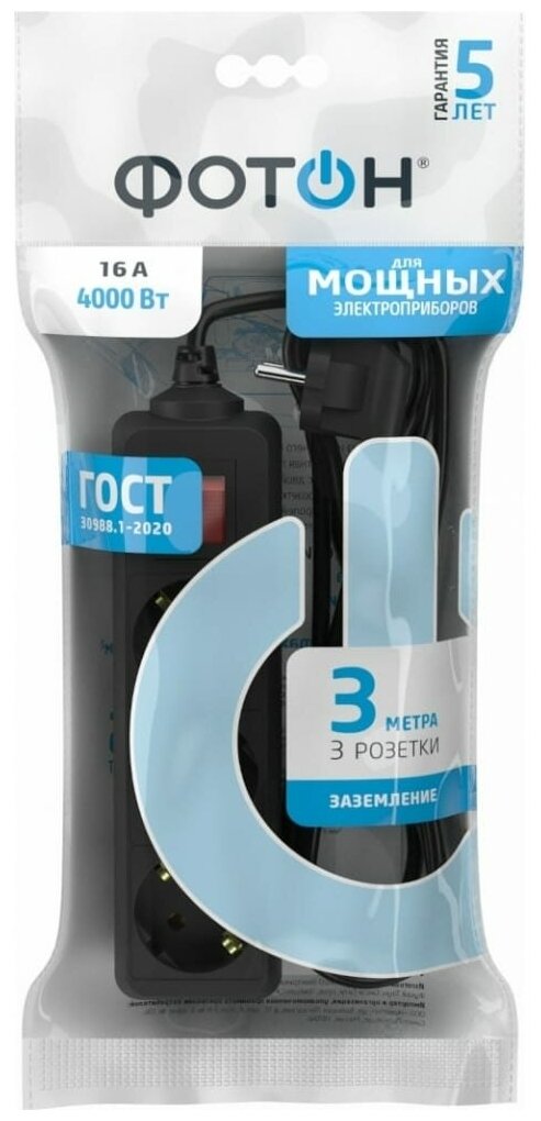 Отзывы на Сетевой удлинитель Фотон 16-33ЕS, 3м, 3 розетки, 16А, с выключателем, с заземлением, Черный 24755 .