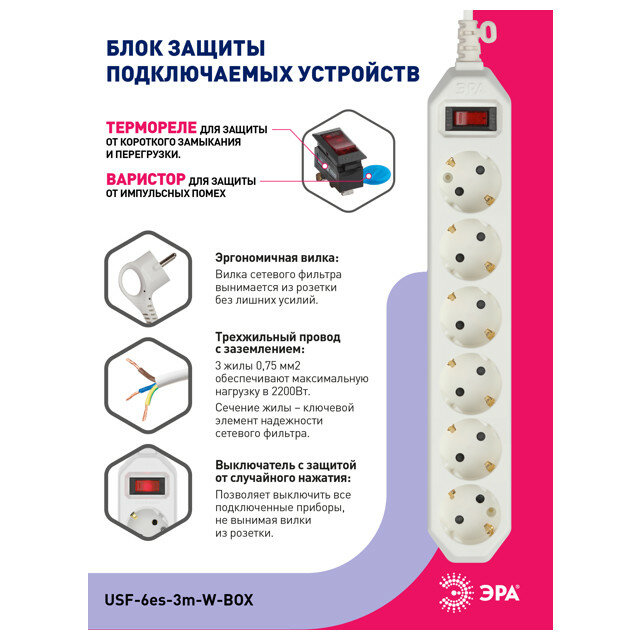 сетевой фильтр ЭРА USF 3м 6-местный с/з 3x0,75кв мм с выключателем белый информация:
