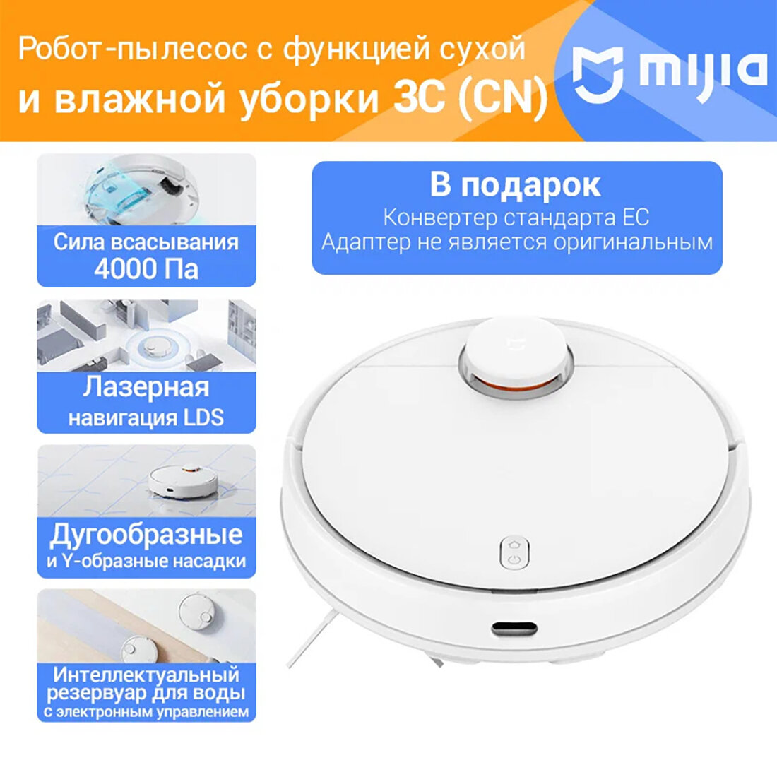 | Дополнительная информация | 3 уровня влажной уборки; отключение при перегреве; материал корпуса: пластик; мощность всасывания: 4000 Па; сканирование 360° на дистанции до 8 м |