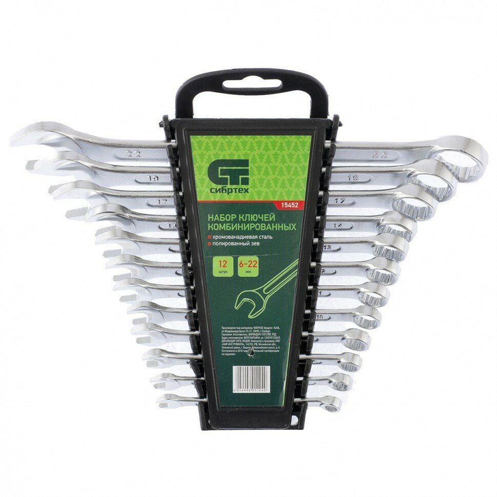 Набор ключей комбинированных 6-22 мм, 12 шт., СИБРТЕХ, CrV, хромированные, держатель с подвесом, 15452 1 701 ₽