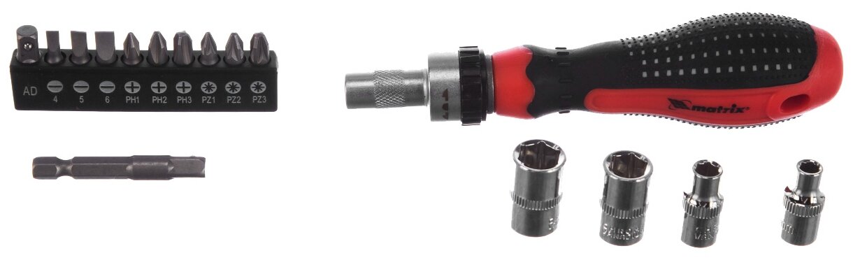 Отвертка реверсивная с набором бит и насадок торцевых, CrV, 1/4, 16 шт Matrix / Отвертка Крестовой шлиц, Прямой шлиц, Pozidriv, Шестигранный шлиц