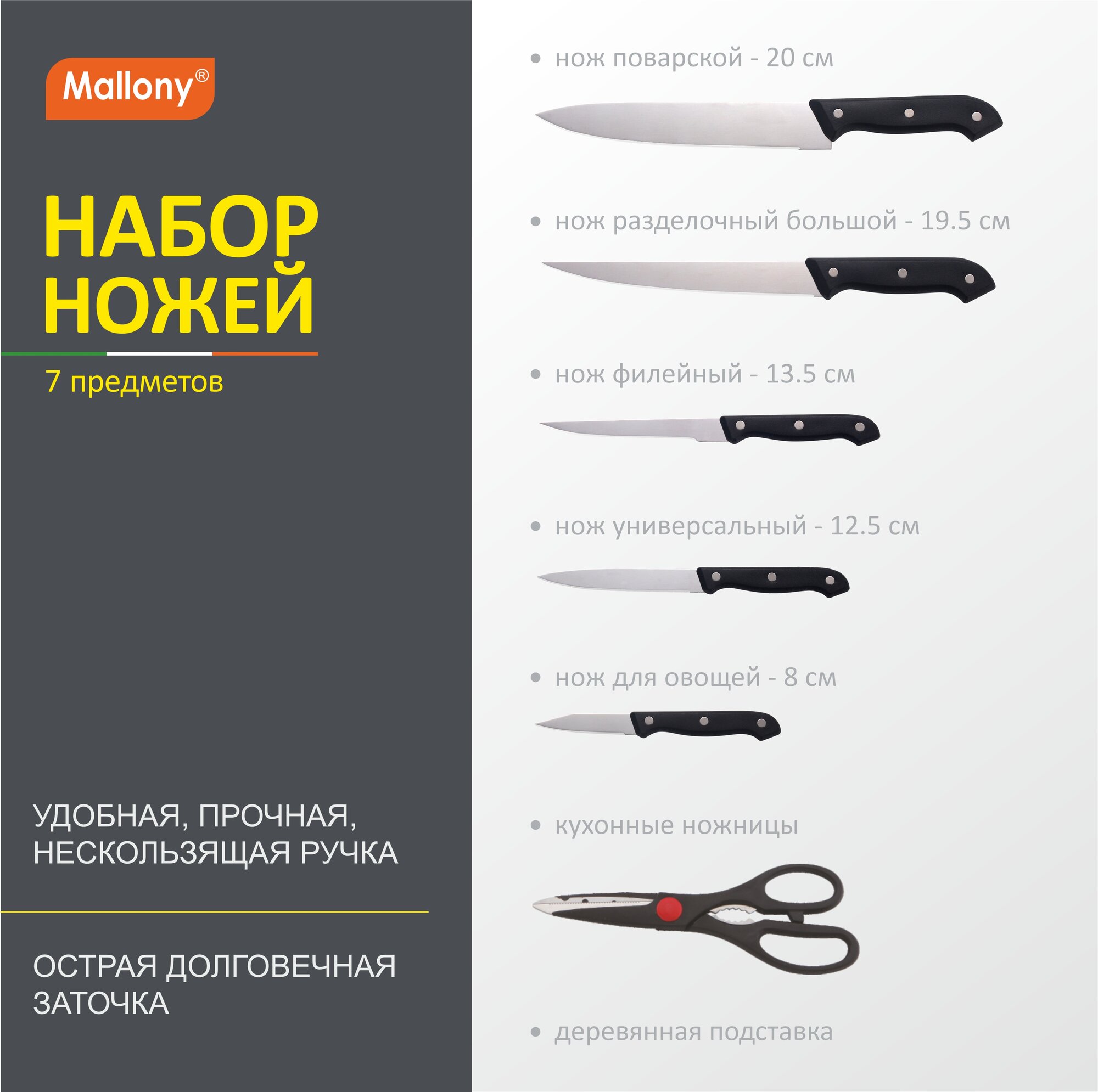 Набор ножей 7 предметов с пластиковой ручкой, модель MAL-S01B 985308 Mallony 1 006 ₽