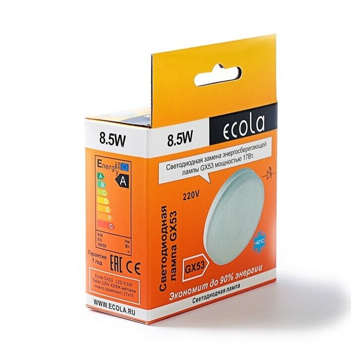 Лампа светодиодная Ecola, GX53, 8.5 Вт, 4200 K, 220 В, 27x75 мм, матовое стекло информация: