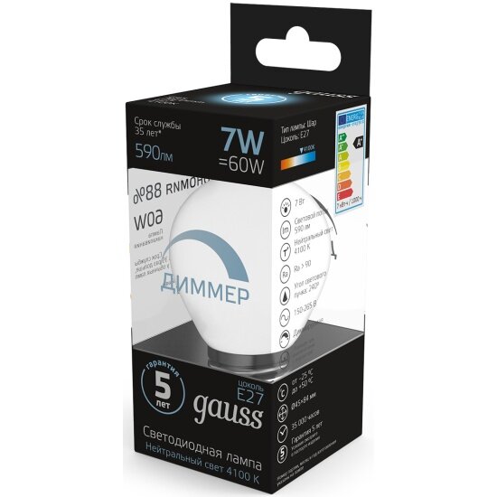 Светодиодная лампа Gauss LED Globe-dim E27 7W 4100К диммируемая информация:
