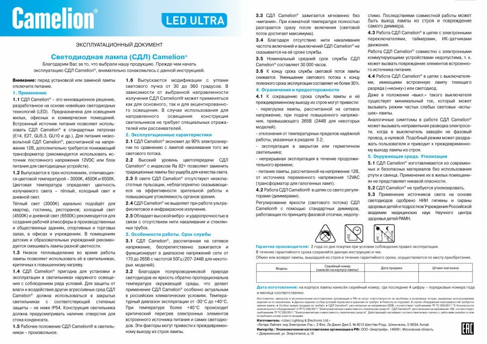 Эл.лампа светодиодная 8W LED8-S108/830/GU5.3 8Вт 220В (JCDR 8W=65Вт 530 Lm) Camelion информация: