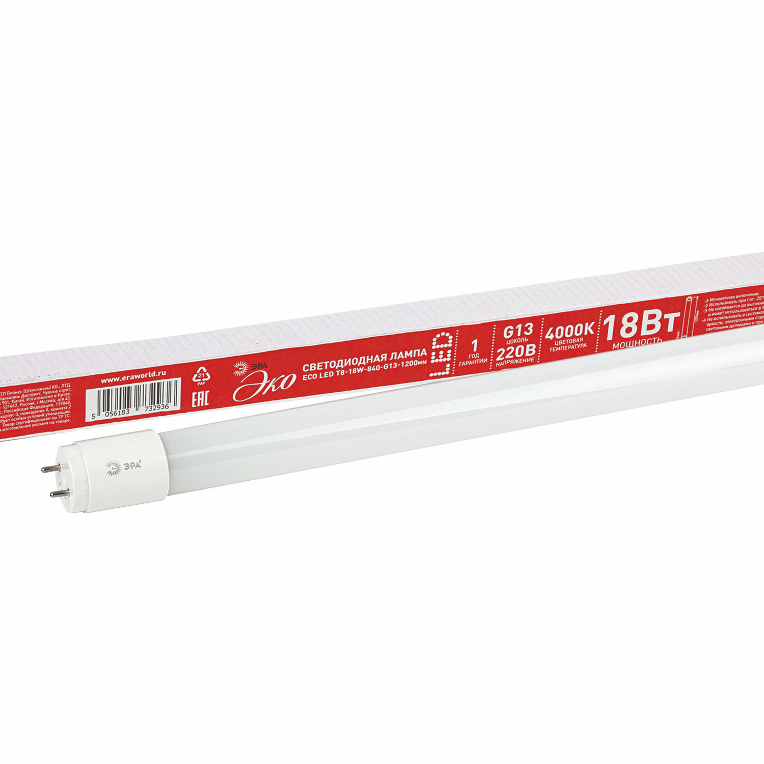 Лампа-трубка светодиодная ЭРА Эко, 18 Вт, 25000 ч, 1200 мм, нейтральный белый, ECO LED T8-18W-840-G13-1200mm информация: