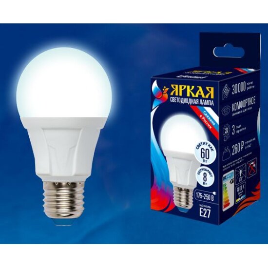 Отзывы на Светодиодная лампа UNIEL LED-A60 8W/NW/E27/FR PLP01WH Форма «А», матовая. Серия Яркая. Белый свет (4000K). Картон. ТМ