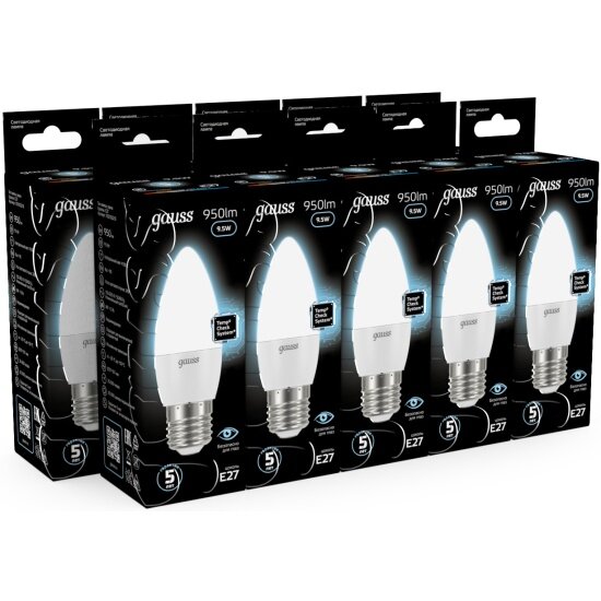 (5 шт.) Светодиодная лампочка Gauss Свеча C37 E27 9.5W(950lm) 4100K 4K 101x37матовая, алюм./пластик 103102210