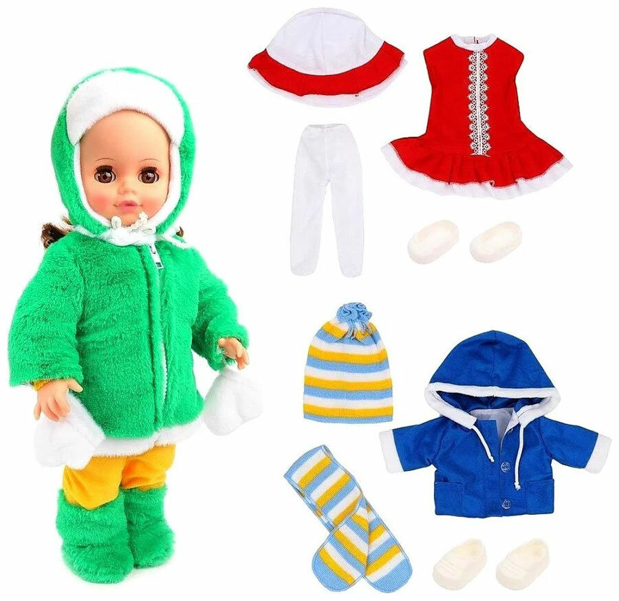 | Комплектация | кукла, куртка из ворсового трикотажа с длинными рукавами, капюшоном и застёжкой спереди на 3 пуговицы, подклад, вязаная шапка ,вязаный шарф, сапожки, платье безрукавное, шляпа, туфли |