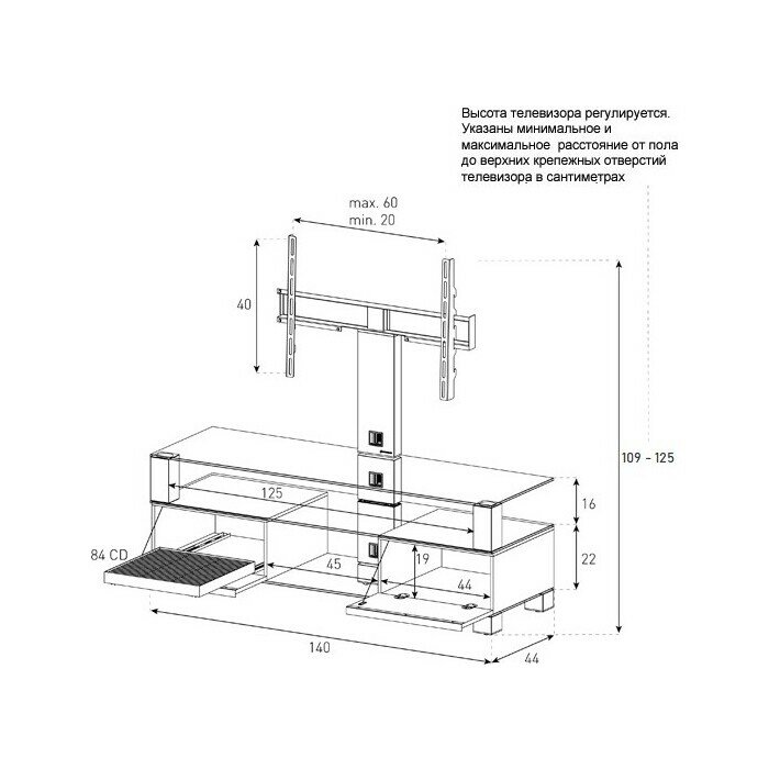 | Дополнительная информация | максимальная нагрузка на верхнюю полку 40 кг, кабель-канал, роликовые колеса, выдвижной ящик |